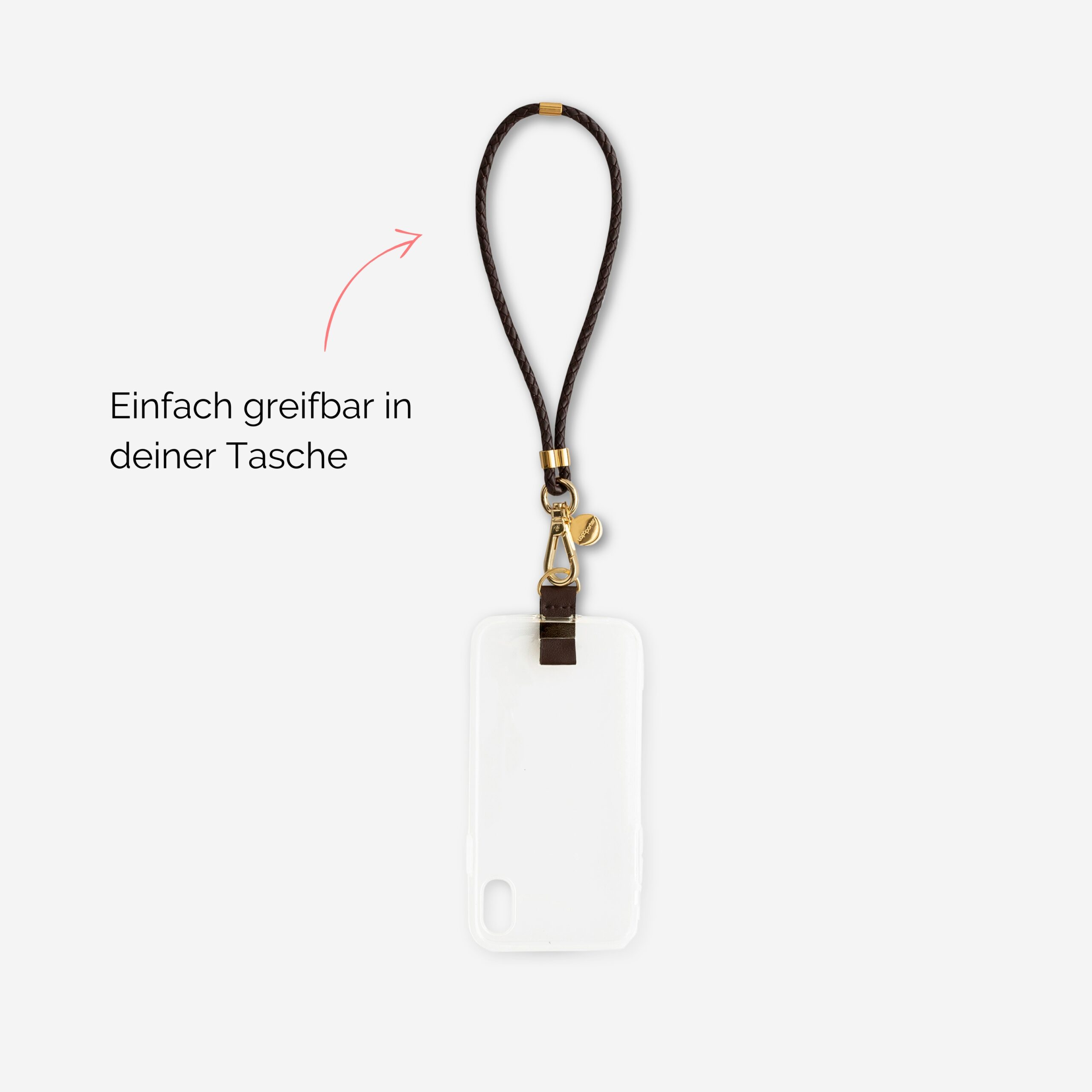 Wir erfanden auch die Aufhängung an der Handyhülle mit den Lederschlaufen. Diese sind besonders haltbar und schonend für dein Smartphone.