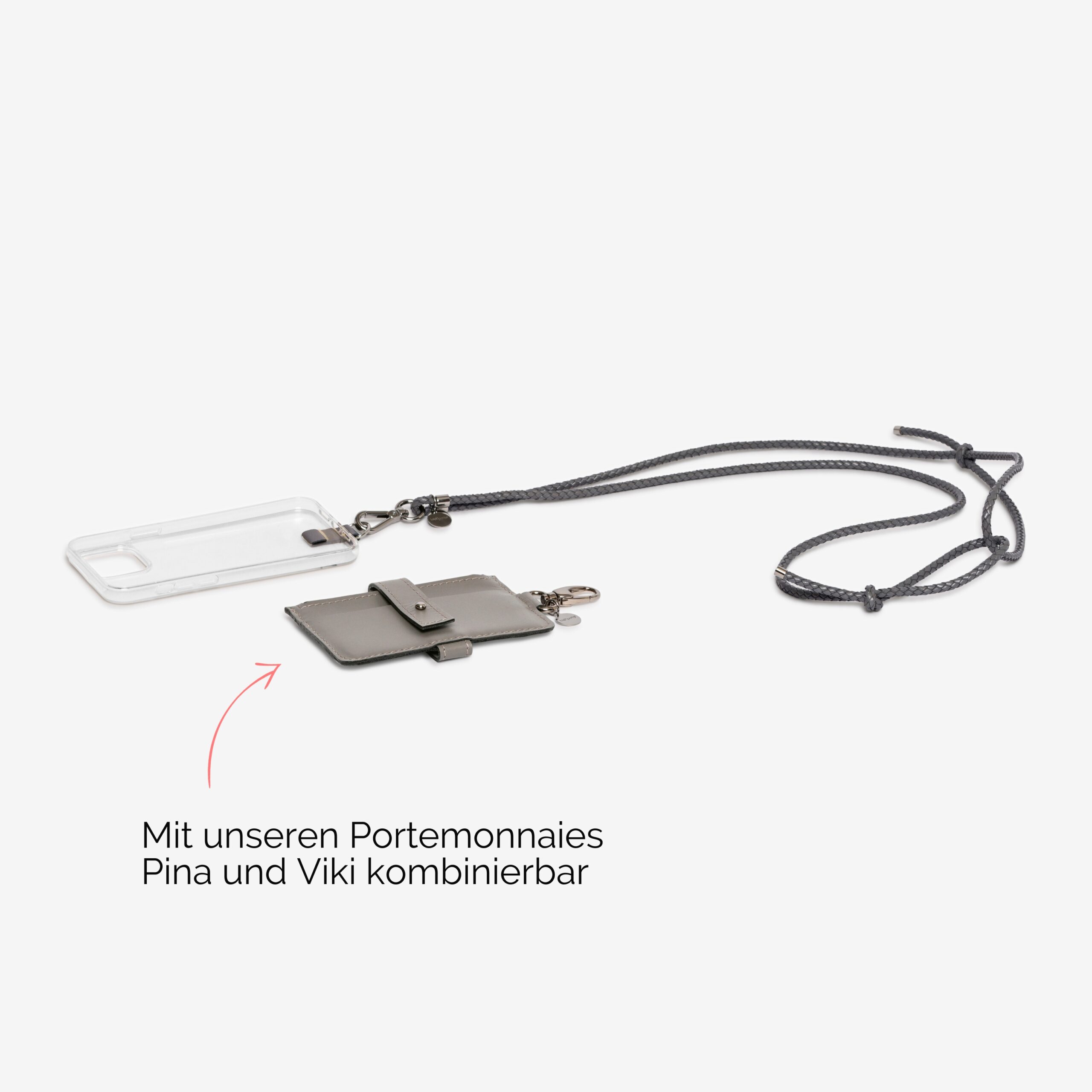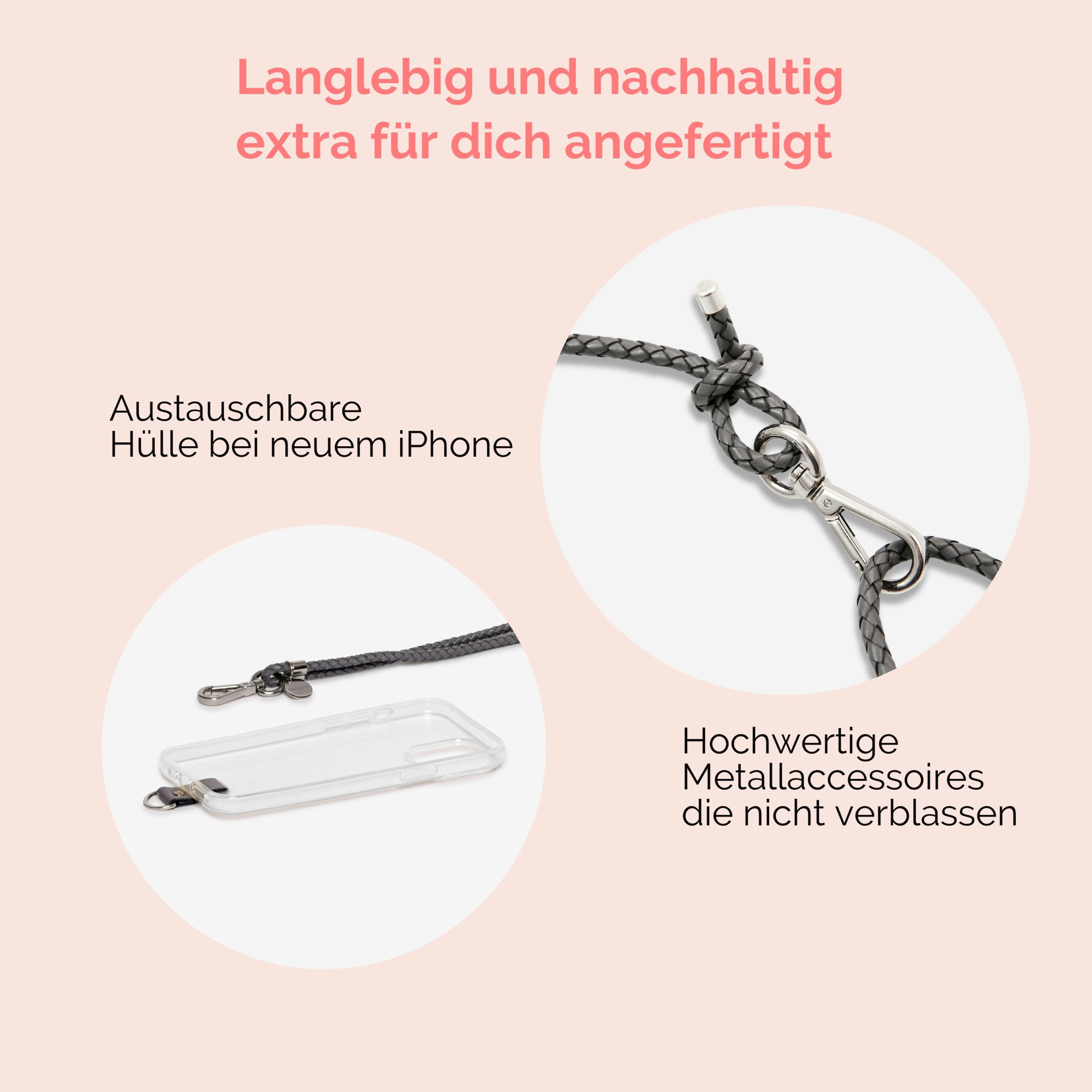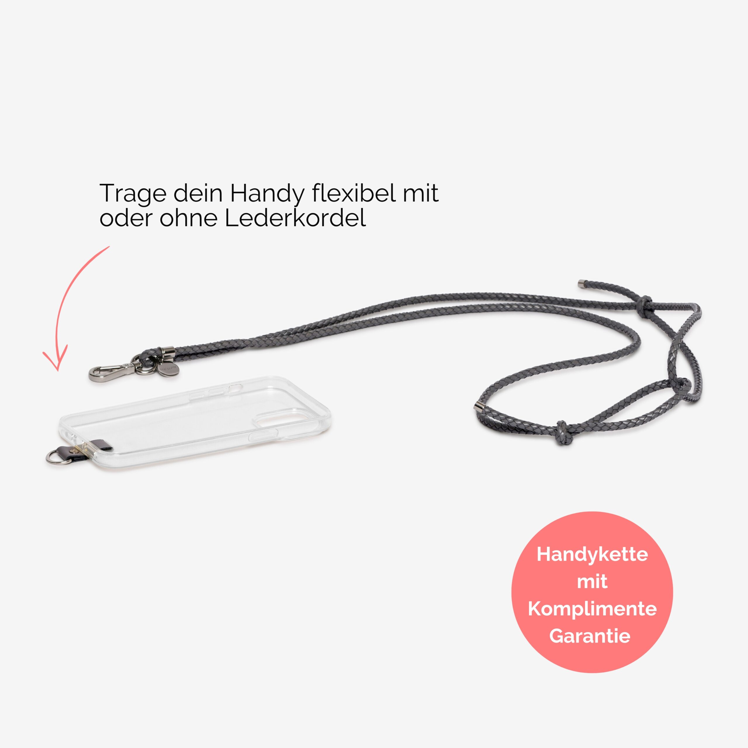 Wir erfanden auch die Aufhängung an der Handyhülle mit den Lederschlaufen. Diese sind besonders haltbar und schonend für dein Smartphone.